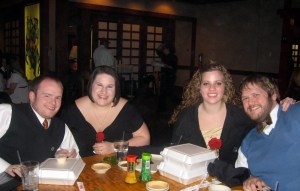 I must say this is one of my favorite days of the year but I am a little partial. February 14th is my birthday as well as Valentines day and this was our first on to share as husband and wife. Overall it was one of my favorite birthday’s ever! My hubby bought me beautiful flowers and my favorite candy Reese’s Peanut Butter Cup and sweet card for valentines day! For my birthday he bought me an fabulous sewing/embroidery machine, and a yummy cookie cake that we shared with friends at lunch after church. For dinner we went to Kanki, which is a sushi and Japanese restaurant, with Jess and Josh! Overall a PERFECT day!