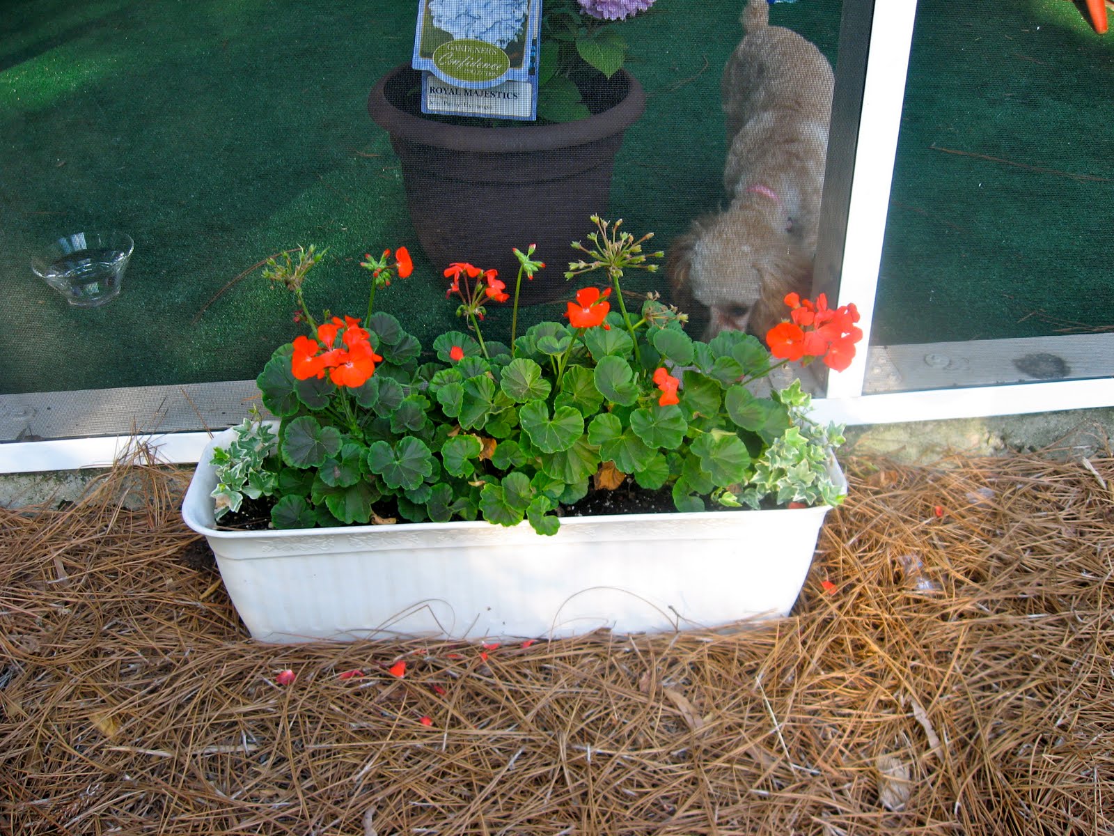 The geraniums and ivy