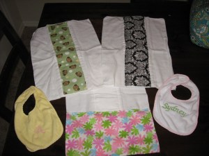I have had a lot of fun teaching myself to sew and recently enjoyed sewing things for my best friend when she had her son Aiden. Now I am elated that I get to sew things for my own baby. It is hard not the be biased in fabric choices. There are so many cute girly fabrics. I can not wait to start on some more sewing projects for little one but until we find out boy or girl I will have to try and find some cute neutral fabrics.