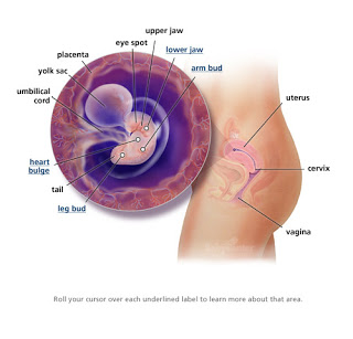 “This week’s major developments: The nose, mouth, and ears that you’ll spend so much time kissing in eight months are beginning to take shape. If you could see into your uterus, you’d find an oversize head and dark spots where your baby’s eyes and nostrils are starting to form. His emerging ears are marked by small depressions on the sides of the head, and his arms and legs by protruding buds. His heart is beating about 100 to 160 times a minute — almost twice as fast as yours — and blood is beginning to course through his body. His intestines are developing, and the bud of tissue that will give rise to his lungs has appeared. His pituitary gland is forming, as are the rest of his brain, muscles, and bones.”