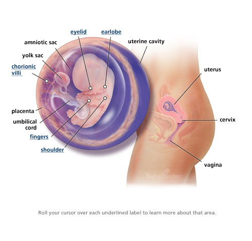 “Your new residents are nearly an inch long — about the size of a grape — and weighs just a fraction of an ounce. They starting to look more and more human. Their essential body parts are accounted for, though they’ll go through plenty of fine-tuning in the coming months. Other changes abound: Your babies hearts finishes dividing into four chambers, and the valves start to form — as do their tiny teeth. The embryonic “tail” is completely gone. Your babies organs, muscles, and nerves are kicking into gear. The external sex organs are there but won’t be distinguishable as male or female for another few weeks.Their eyes are fully formed, but their eyelids are fused shut and won’t open until 27 weeks. They have tiny earlobes, and their mouth, nose, and nostrils are more distinct. The placenta is developed enough now to take over most of the critical job of producing hormones. Now that your babies basic physiology is in place, their poised for rapid weight gain.”